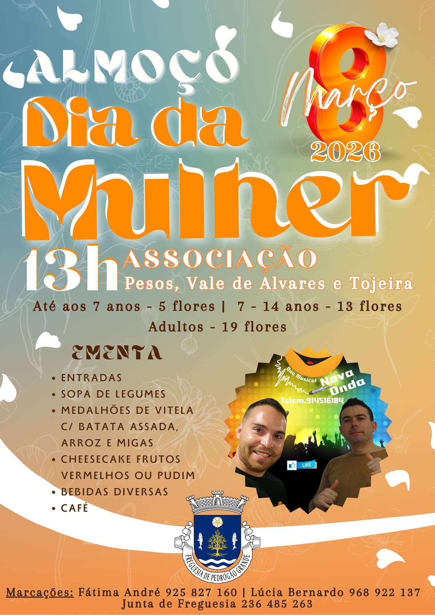 No próximo dia 8 de março, às 13h, vamos celebrar juntas o Dia Internacional da Mulher com um almoço especial na Associação Cultura e Recreio de Pesos Vale de Álvares e Tojeira.